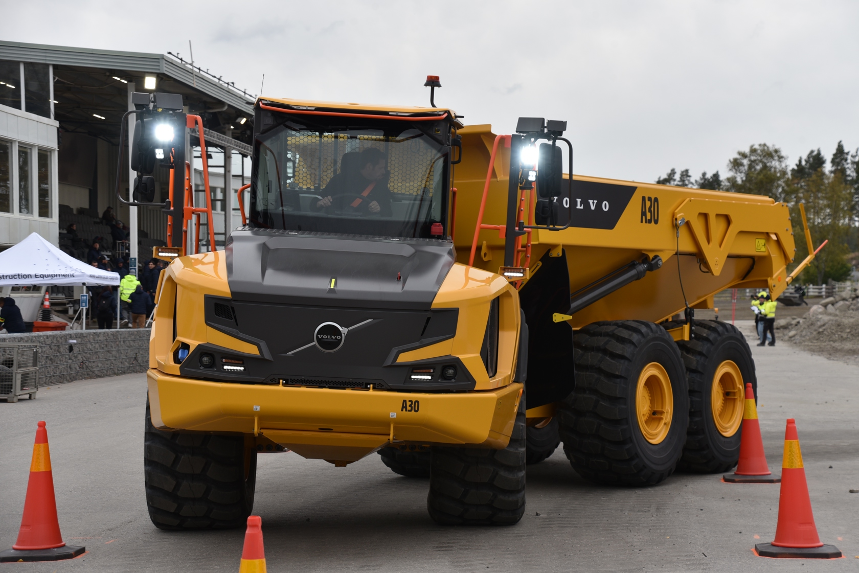 Mit einem knickgelenkten Dumper A30 müssen die Fahrer einen Reifen mithilfe eines Stabs aufnehmen und rückwärts zentimetergenau in eine Zielzone manövrieren – hier trennt Millimeterarbeit echte Champions vom Rest.